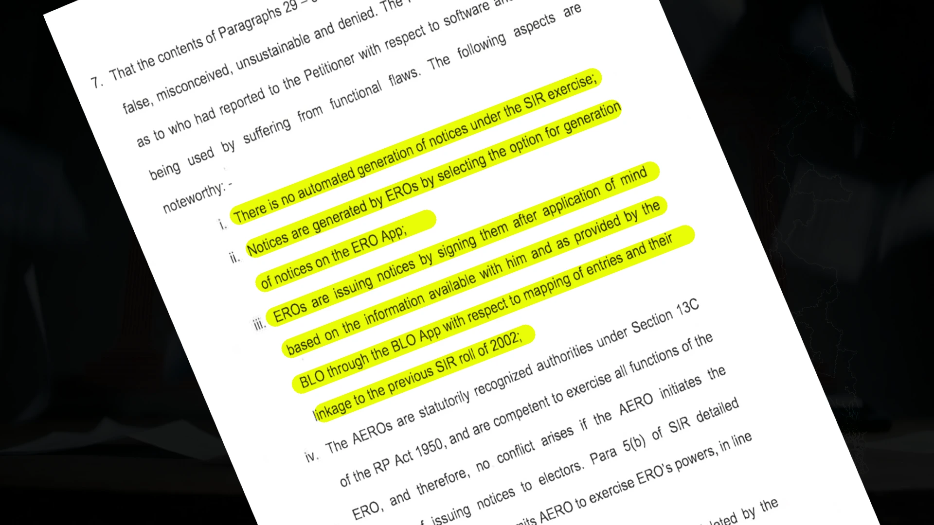 It told the Court, “EROs are issuing notices by signing them after application of mind based on information available with him and as provided by BLO through the BLO App with respect to mapping of entries and their linkage to the 2002 rolls.”