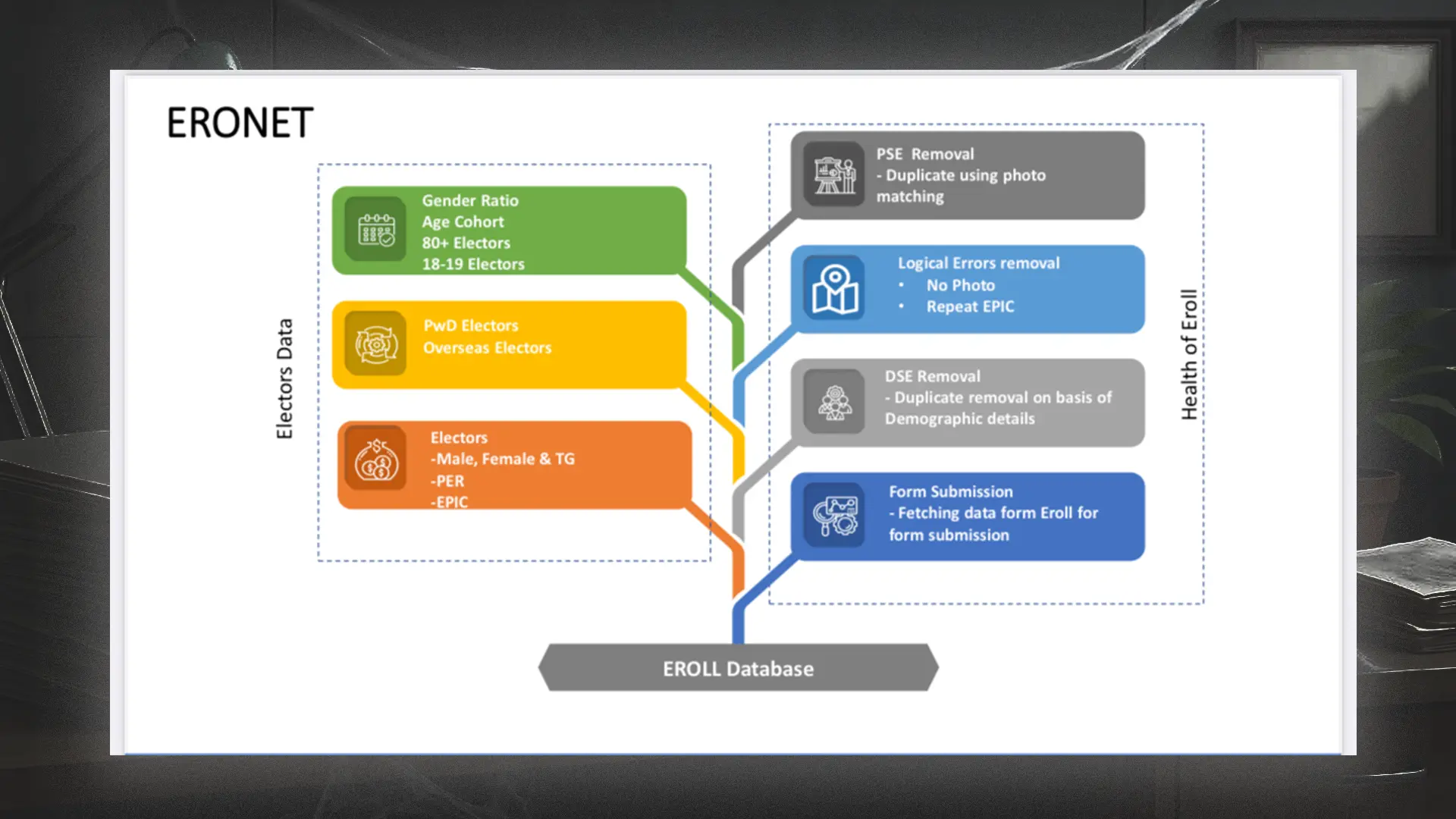 The Election Commission’s presentations on ERONET reveal that this application can identify suspect entries that are demographically similar. In other words, it detects similarities in names, names of relatives, addresses, and ages to identify suspect duplicates and fraud. It can also match photographs on Voter IDs (called EPIC) to detect potential fraud and duplicates.