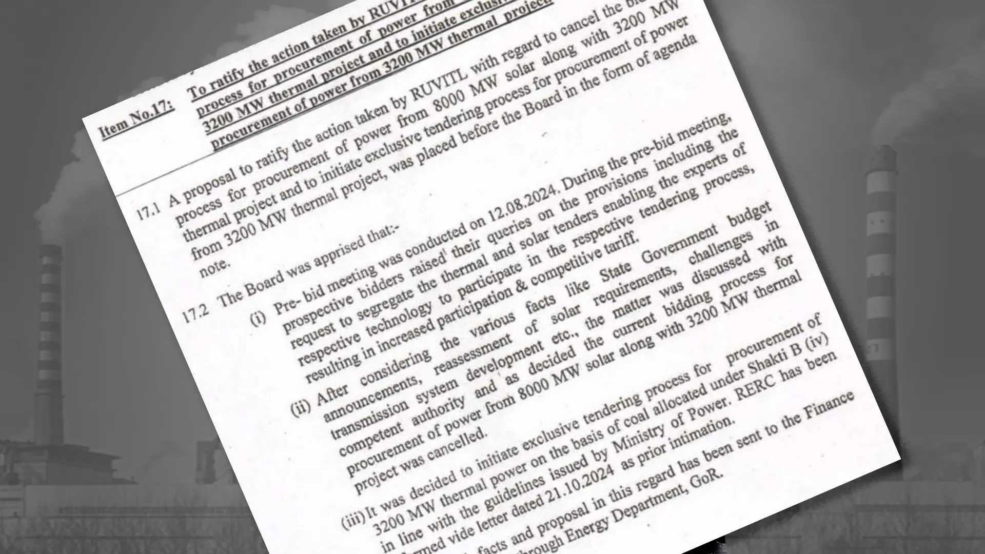 After scrapping the bundled tender, the RUVITL decided to invite bids exclusively for the 3,200 MW thermal capacity, dropping the solar component altogether. It was concluded that evacuating 8,000 MW of solar power would strain transmission infrastructure, and that the state government is prioritising decentralised solar generation instead, documents reviewed by The Reporters’ Collective show.