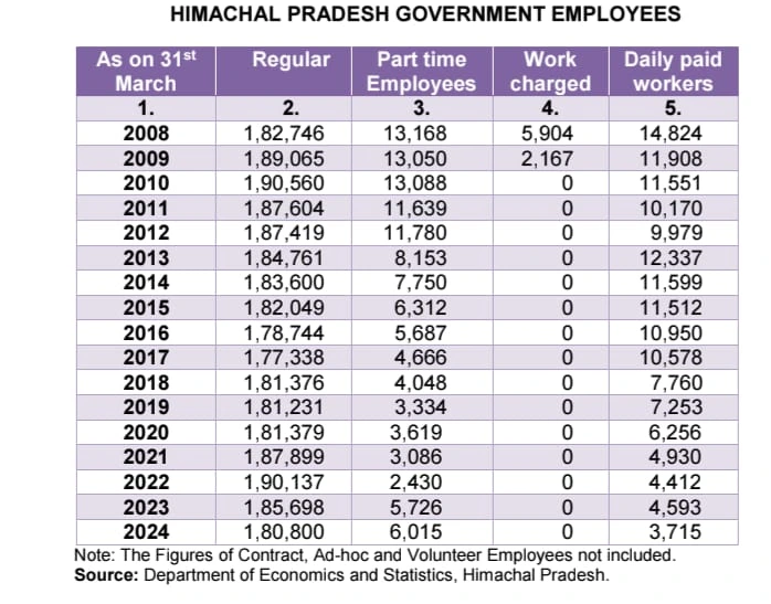 Centre of Indian Trade Unions state president Vijendra Mehra told The Reporters’ Collective that the number of regular government employees in Himachal Pradesh has not kept pace with the state’s growing population and expanding public services. While the state population nearly doubled from around 34 lakh in 1971 to around 68 lakh in 2011, the strength of regular government staff has largely stagnated in recent years. According to figures cited by Mehra, the state had around 1.81 lakh regular employees in 2019, which rose to about 1.90 lakh in 2022 before falling to roughly 1.80 lakh in 2024 – the lowest level in more than five years.